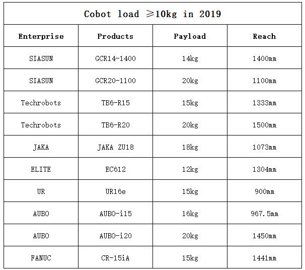 According to incomplete statistics, in 2019, co-robot manufacturers promoted some enterprises with a payload greater than 10kg: